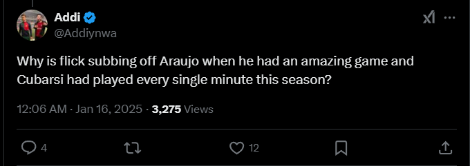 Addi: «Чому Флік замінив Араухо, коли той провів приголомшливий матч, а Кубарсі відіграв все до єдиної хвилини в цьому сезоні?».