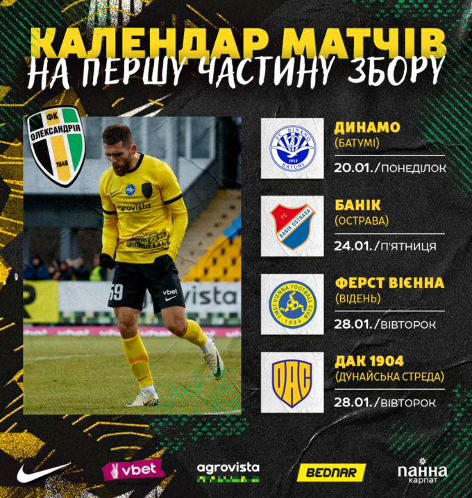Наступним суперником «Олександрії» стане «Банік» (Острава). Гра запланована на 24 січня. 28 січня український клуб проведе одразу два поєдинки. «Олександрії» протистоятимуть «Ферст Вієнна» (Відень) та «ДАК 1904» (Дунайська Стреда).