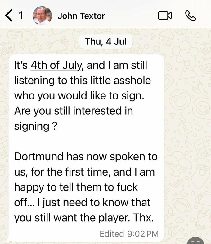Зараз «Дортмунд» із нами вперше поспілкувався, і я з радістю скажу їм, щоб вони йшли до біса... Мені просто потрібно знати, що ви все ще хочете цього гравця. Дякую».