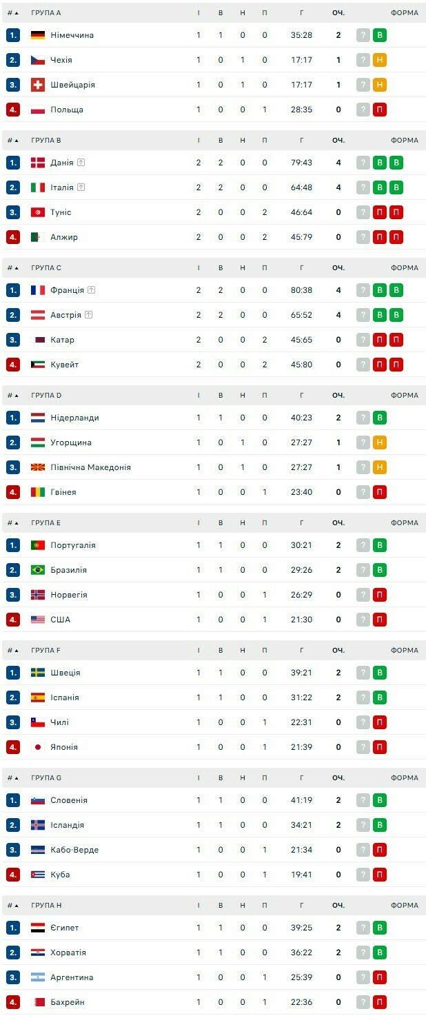 Данія, Італія, Франція та Австрія здобули по дві перемоги у двох матчах