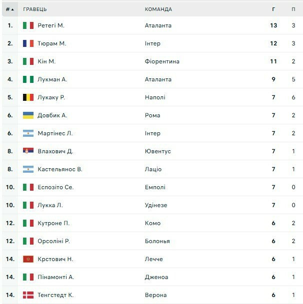 Більше за Довбика у поточному сезоні Серії А забили лише Матео Ретегі (Аталанта) – 13 голів, Маркус Тюрам (Інтер) – 12 голів, Мойзе Кін (Фіорентина) – 11 голів, Адемола Лукман (Аталанта) - 9 голів.