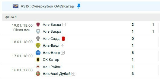 - 17:00. Аль-Райян (Катар) – Шабаб Аль-Ахлі (ОАЕ) – 1:3