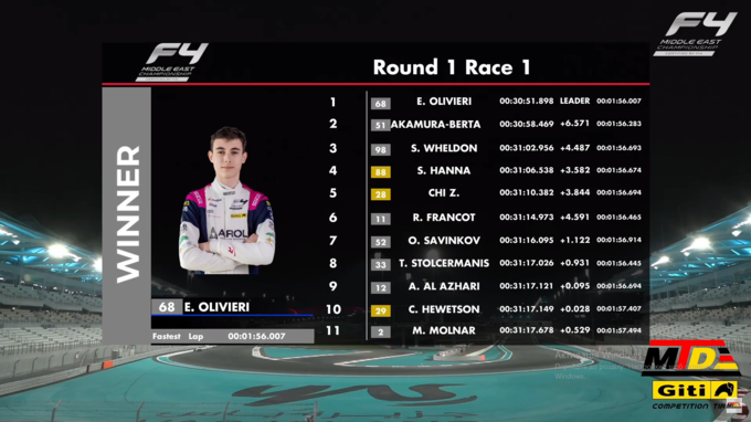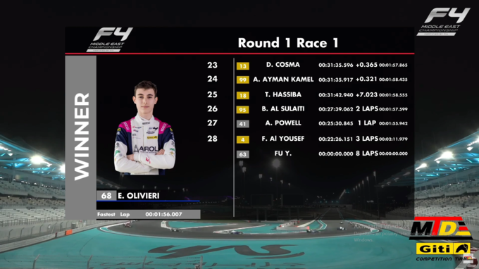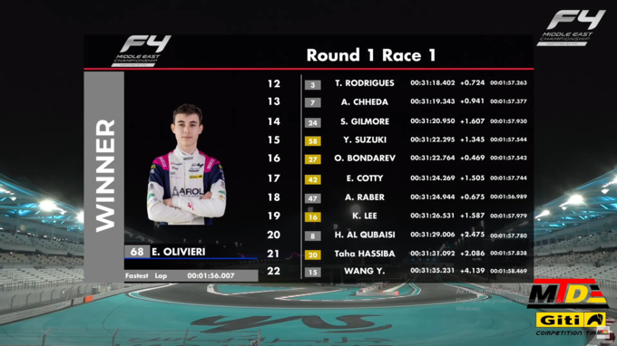 Закінчилася перша гонка етапу в Абу-Дабі Формули-4 Middle East. Переможцем став італієць Емануель Олів'єрі у складі команди R-ACE GP. Що стосується Бондарева, то він стартував із 17-ї позиції, але на початку гонки зміг прорватися ближче до очкової зони — на 13-те місце. За 26 хвилин до фінішу на трасу виїхала машина безпеки, яка стримувала пелотон протягом 8 хвилин, після чого заїзд продовжився.