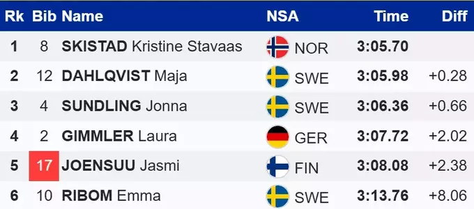 Перемогу в гонці святкувала спортсменка з Норвегії Крістін Шістад, яка в перший раз у цьому сезоні прибігла першою на Кубку світу. Крістін на 0.28 секунди обігнала шведку Майю Дальквіст, що зайняла другу сходинку. А от трійку замкнула інша представниця шведської команди Йонна Сундлінг.