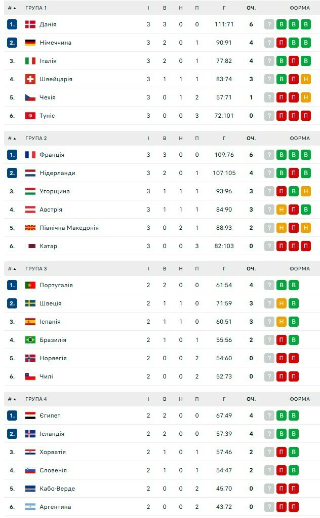 Данія та Франція здобули чергові перемоги та лідирують у своїх групах (по 6 очок з 6).