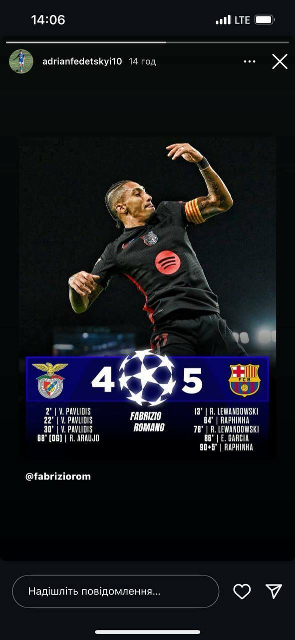Після завершення вчорашнього матчу Ліги чемпіонів «Бенфіка» - «Барселона» Адріан зробив репост в IG Фабріціо Романо з результатом матчу.