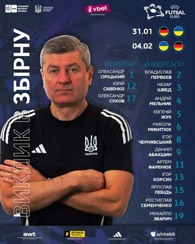 Збірна України з футзалу продовжить відбір на Євро-2026 двома матчами проти Німеччини, які відбудуться 31 січня та 4 лютого. Наставник Олександр Косенко оголосив заявку на ці зустрічі.