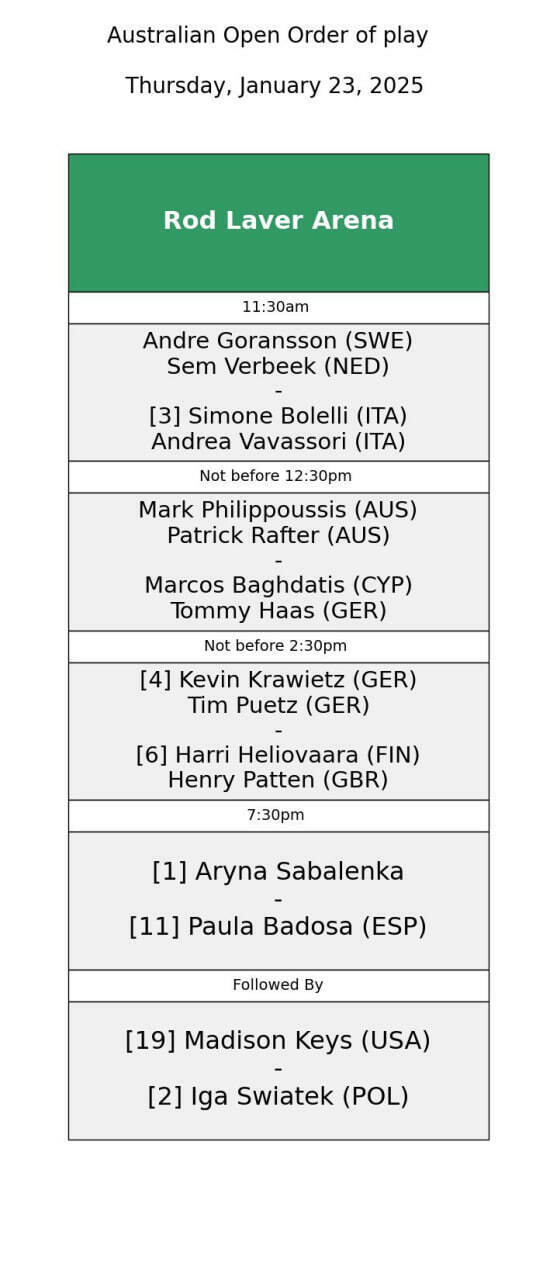 Розклад матчів 1/2 фіналу в жіночому одиночному і парному чоловічому розрядах, 23 січня