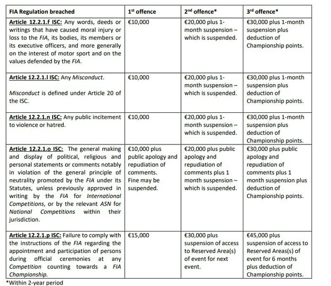 Наприклад, порушення пункту f), яке визначає «заподіяння моральної шкоди або збитків FIA» або її посадовим особам, тепер карається штрафом у розмірі 10 000 євро за перше порушення.