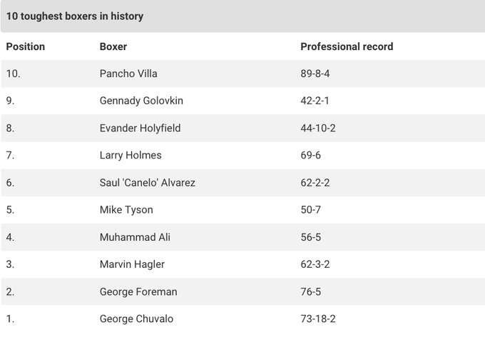 Першу сходинку посів канадець Джордж Чувало, який прославився тим, що за 93 поєдинки так і ні разу не побував на канвасі. Чувало проводив бої з такими легендами, як Форман, Алі та Фрейзер.