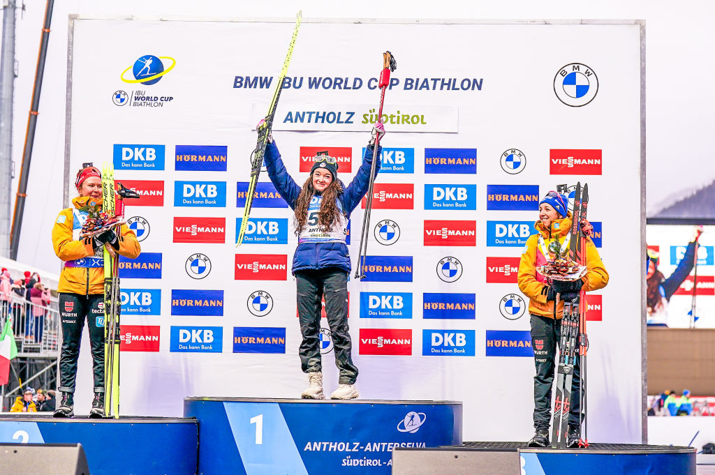 У Рупольдингу ознаки повернення до непоганої форми продемонструвала Доротея Вірер. На своїй домашній трасі вона теж була у повному порядку, і потрапити на подіум їй завадив один промах. Італійка стала четвертою. За нею дружно розмістилося французьке тріо Жюлія Сімон, Жанні Рішар та Осеан Мішлон. Присутність чотирьох француженок у топ-10 уже нікого не дивує. Швейцарка Емі Басерга після найкращого у кар’єрі етапу в Рупольдингу знов опинилася на видноті, посівши восьме місце.