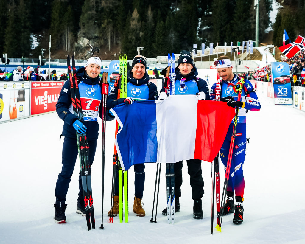 На екваторі гонки перевага французів над норвежцями становила уже 38 секунд, а Ерік Перро, закривши 10 з 10 мішеней, випереджав Йоганнеса Бьо уже майже на хвилину. Емільєну Жаклену для загальної перемоги збірної Франції залишалося тільки не застрелитись чи десь не впасти. Із другим якраз і не склалося перед стійкою, але на цьому багато часу він не втратив і гвинтівку не пошкодив, у підсумку здобувши зі своєю командою чотири перемоги в естафетах на КС із чотирьох можливих.