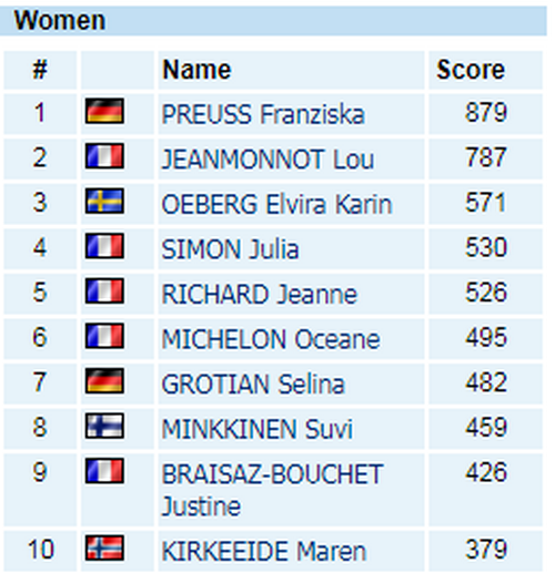 У загальному заліку Кубка світу перевага Пройсс над Жанмонно зменшилася до 92-х очок. Третьою навіть після пропуску етапу в Антгольці залишається Ельвіра Еберг, проте на ВКГ вона тепер не претендує. Ба більше, до шведки підбирається тріо француженок.