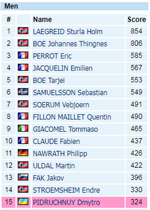 Блискучу функціональну підготовку продемонстрував Дмитро Підручний. Пішовши на трасу прямо перед групою головних фаворитів, він ідеально відстрілявся на лежці, а ось на стійці припустився одного промаху. І, незважаючи на це, очолив проміжний протокол, випередивши 35 спортсменів, які стартували перед ним. З решти біатлоністів обійти його після другої стрільби змогли лише п’ятеро. Але Бьо-молодший провалив фінальне коло, тож Підручний фінішував 5-м з відставанням у 22 секунди від Бьо-старшого. Штрафне коло чоловіки проходять за 22-23 секунди, тож нескладно вирахувати, що за умови чистої стрільби Підручний точно претендував би на перемогу у гонці. Ще одним приємним моментом стало розгортання Дмитром разом із норвежцем Улдалем українського прапору під час квіткової церемонії.