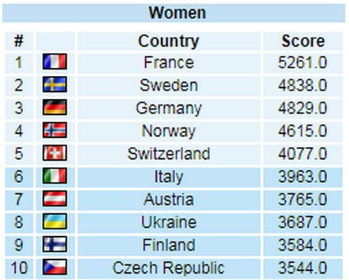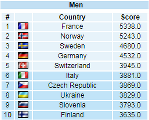 У Кубку націй збірна Франції продовжує нарощувати відрив від Норвегії, а збірна Швеції, як і раніше, перебуває на третій позиції.