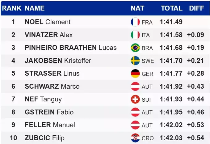 Із загальним часом 1:41.49 здобув перемогу в змаганні французький спортсмен Клеман Ноель. Гірськолижник в четвертий раз став тріумфатором слалому в поточному сезоні. За ним розташувався італієць Алекс Вінатцер, який після другої спроби піднявся з 11-го місця на друге. Третім фінішував натуралізований бразилець Лукас Бротен.