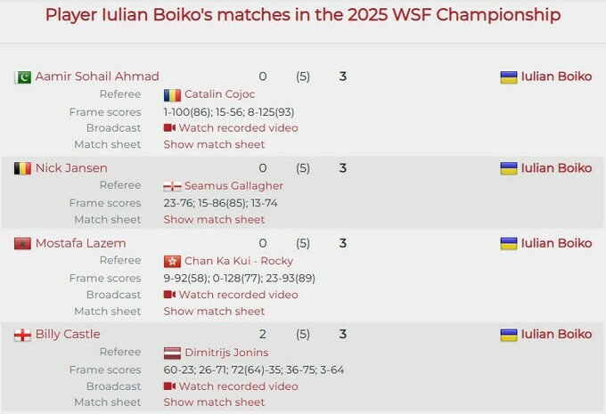 ВІДЕО. Запис матчів Юліана Бойка у турнірі 2025 WSF Championship