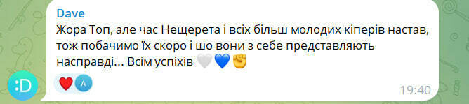 Dave: «Жора Топ, але час Нещерета і всіх більш молодих кіперів настав, тож побачимо їх скоро і шо вони з себе представляють насправді... Всім успіхів».