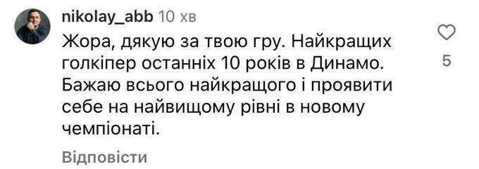 Nikolay_abb: «Жора, дякую за твою гру. Найкращий голкіпер останніх 10 років в «Динамо»». Бажаю всього найкращого і проявити себе на найвищому рівні в новому чемпіонаті».