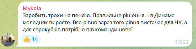 Mykola: «Заробить трохи на пенсію. Правильне рішення. І в «Динамо» молодь виросте. Все-рівно зараз того рівня вистачає для УПЛ, а для єврокубків потрібно пів команди нової».