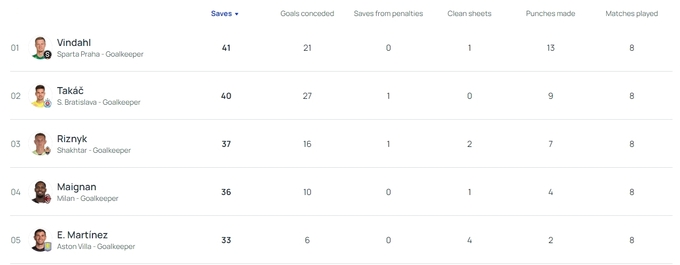 Довгий час найкращим був гравець Мілана Марк Меньян, але італійська команда вчора несподівано програла Динамо Загреб, що погіршило показники воротаря.