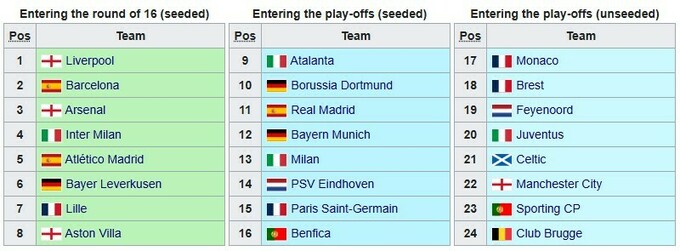 8 найкращих команд ліги автоматично вийшли до 1/8 фіналу. А на стадії 1/16 фіналу зіграють команди, що посіли місця з 9-го до 24-го.