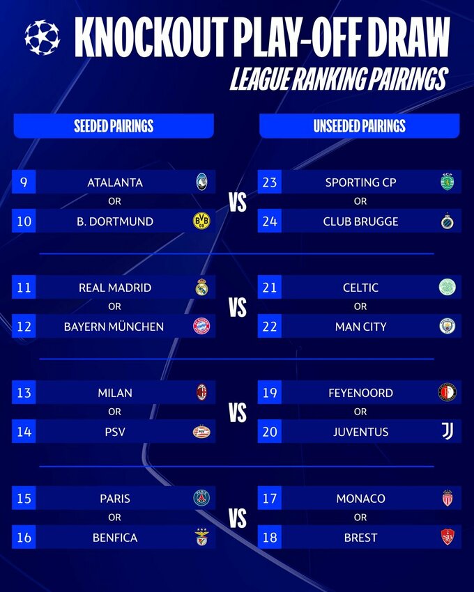 Далі турнір піде за сіткою плей-оф. Команди, які закінчили лігову стадію з 9-го по 16-те місце, будуть сіяними. Вони зустрінуться з командами, які посіли з 17 по 24 місця. Сіяні команди зіграють матч-відповідь удома.