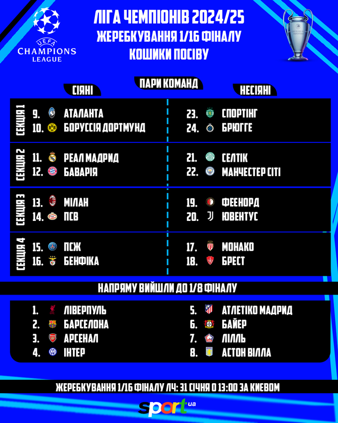 31 січня о 13:00 за київським часом у швейцарському Ньоні відбудеться жеребкування 1/16 фіналу Ліги чемпіонів УЄФА 2024/25.