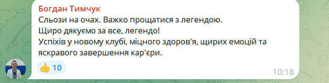 Богдан Тимчук: «Сльози на очах. Важко прощатися з легендою. Щиро дякуємо за все, легендо! Успіхів у новому клубі, міцного здоров'я, щирих емоцій та яскравого завершення кар'єри».
