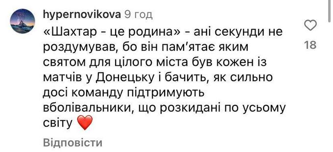 Hypernovikova: «Шахтар – це родина» – ані секунди не роздумував, бо він пам'ятає яким святом для цілого міста був кожен із матчів у Донецьку і бачить, як сильно досі команду підтримують вболівальники, що розкидані по усьому світу».