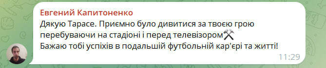Евгений Капитоненко: «Дякую Тарасе. Приємно було дивитися за твоєю грою перебуваючи на стадіоні і перед телевізором. Бажаю тобі успіхів в подальшій футбольній кар'єрі та житті!».