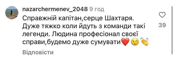 Nazarchermenev_2048: «Справжній капітан, серце «Шахтаря». Дуже тяжко коли йдуть з команди такі легенди. Людина професіонал своєї справи, будемо дуже сумувати».