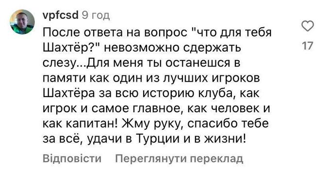 Vpfcsd: «Після відповіді на запитання «що для тебе Шахтар?» неможливо стримати сльозу... Для мене ти залишишся в пам'яті як один із найкращих гравців «Шахтаря» за всю історію клубу, як гравець і найголовніше, як людина і як капітан! Тисну руку, спасибі тобі за все, удачі в Туреччині і в житті!».