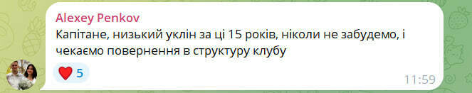 Alexey Penkov: «Капітане, низький уклін за ці 15 років, ніколи не забудемо, і чекаємо повернення в структуру клубу».