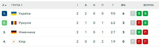 У грудні синьо-жовті стартували у групі 1 з перемог над Кіпром (7:0) та Румунією (2:0). Збірна України очолює групу із 6 очками з 6. Далі йдуть Румунія, Німеччина (по 3), Кіпр (0).