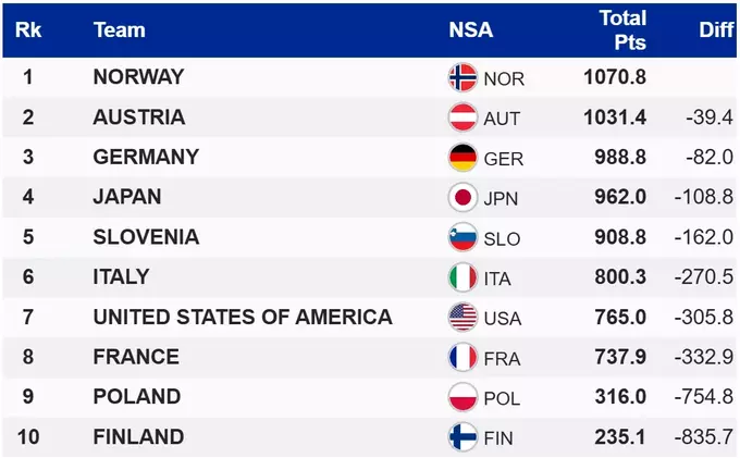 Збірна Норвегії, яку представляли Теа Міньян Бьорнсет, Крістоффер Еріксен Сундал, Айрін Марія Квандал та Йоханн Андре Форфанг, набрала 1070.8 балів та посіла перше місце в командному турнірі. Другими фінішували австрійці, програвши лідеру 39.4 бали. Третіми стали представники Німеччини.