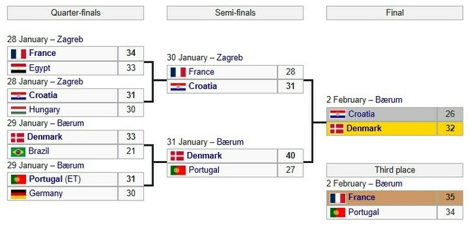 Раніше у півфіналах Данії розгромила Португалію (40:27), а Хорватія сенсаційно обіграла команду Франції (31:28).