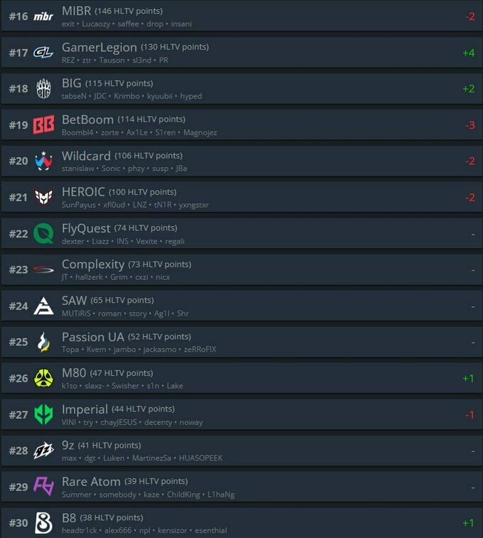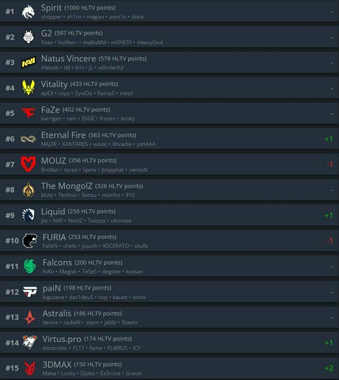 Серед інших змін варто відзначити підйом Eternal Fire на 6-ту позицію та Liquid на 9-те місце, у той час як MOUZ і FURIA втратили одну позицію.