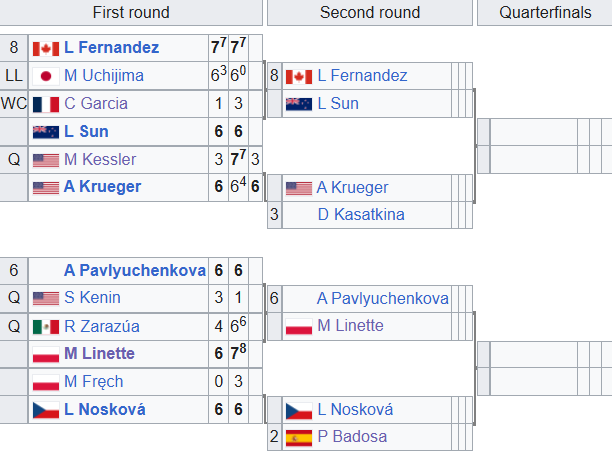 4 лютого до 2-го кола також пройшли Лейла Фернандес, Лінда Носкова, Магда Лінетт і Анастасія Павлюченкова.