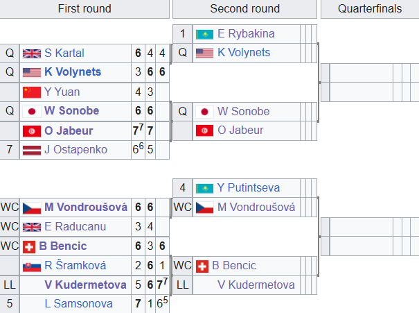 Жабер у 2-му раунді зіграє проти 17-річної японки Вакани Сонобе (Японія, WTA 837), яка пройшла кваліфікацію і 1-ше коло, обігравши трьох тенісисток із топ-100. Вондроушова в 1/8 фіналу зустрінеться з четвертою сіяною Юлією Путінцевою (Казахстан, WTA 21).