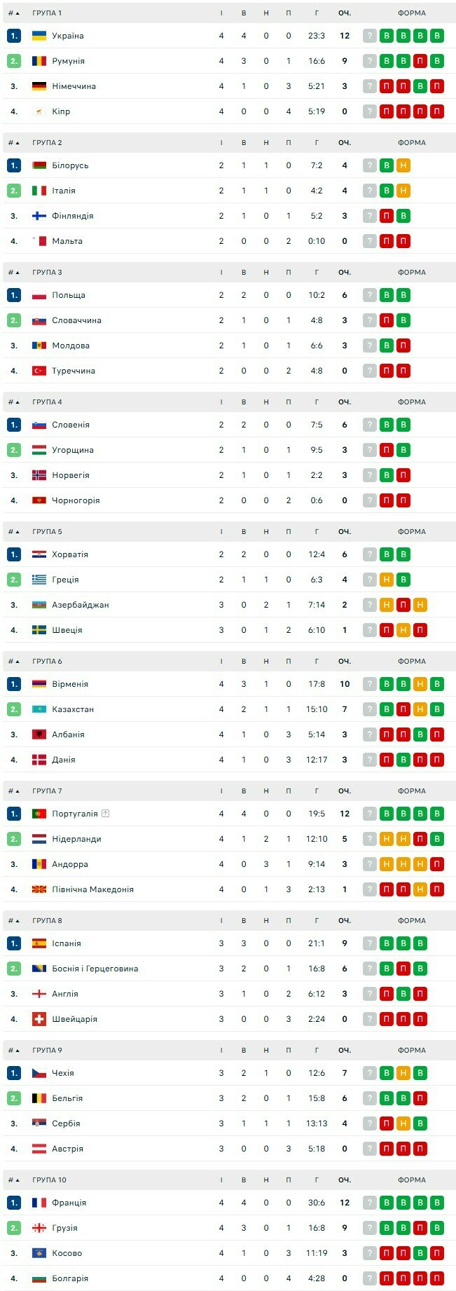 Україна після чотирьох турів має 12 очок з 12 можливих (різниця м'ячів: 23–3) та посідає перше місце у групі 1.