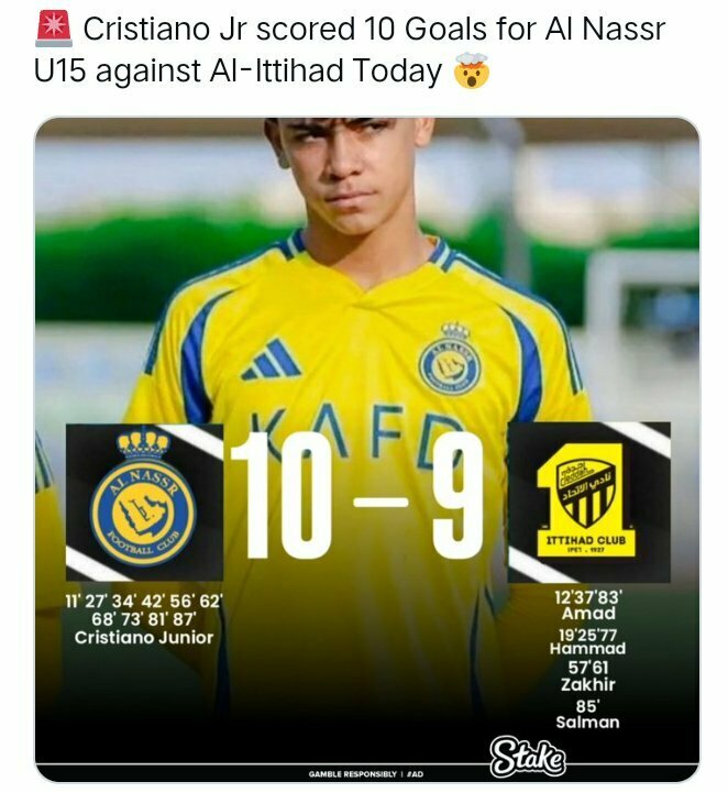 Ця інформація є розіграшем у відповідь на фейк про те, що син Кріштіану Роналду в нещодавньому матчі за юнаком клубу Аль-Наср забив 10 м'ячів у ворота однолітків із команди Аль-Іттіхад.