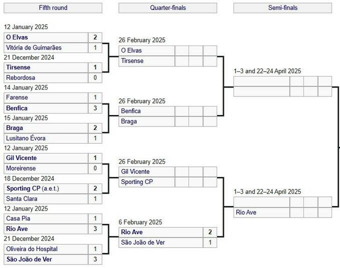 В інших матчах 1/4 фіналу 26 лютого зіграють: Елвас [D4] – Тірсенсе [D4], Бенфіка – Брага, Жіл Вісенте – Спортінг.
