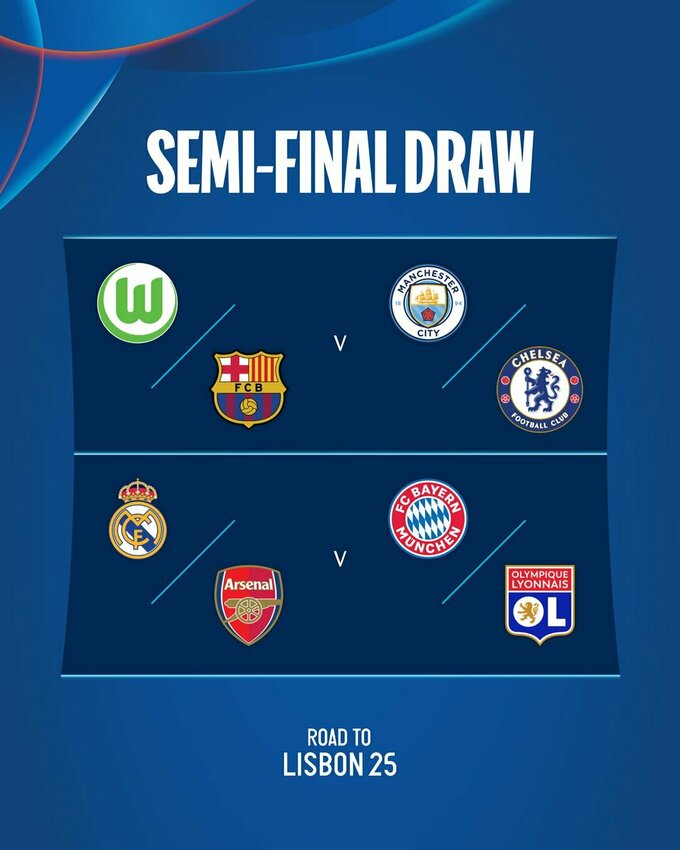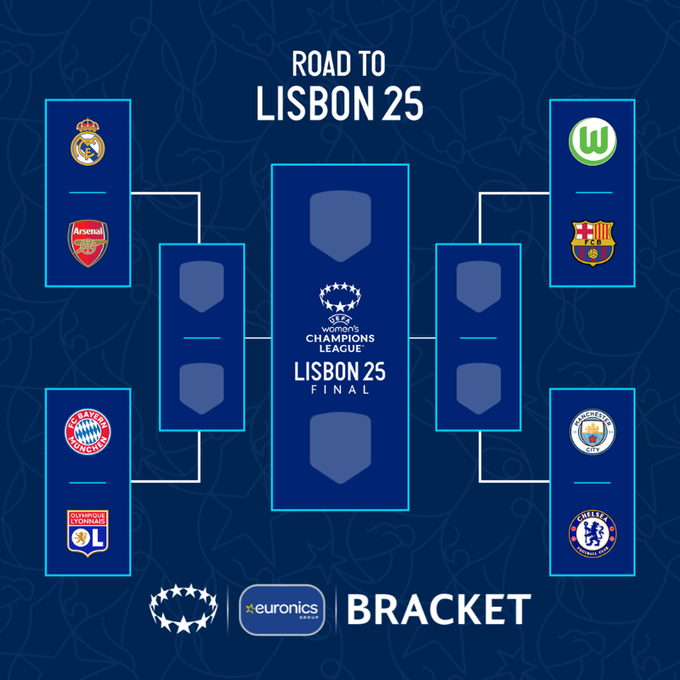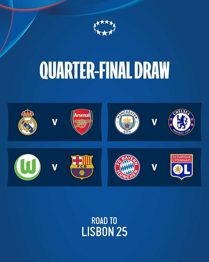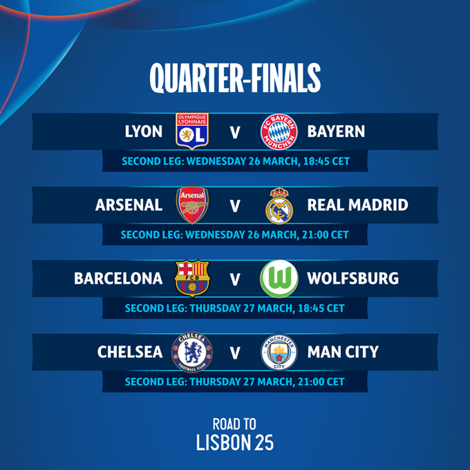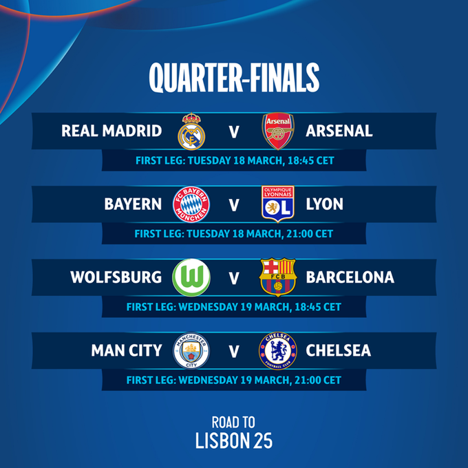 У 1/4 фіналу відбудеться англійське дербі: Манчестер Сіті – Челсі. В інших парах зіграють: Реал Мадрид – Арсенал, Вольфсбург – Барселона, Баварія – Ліон.