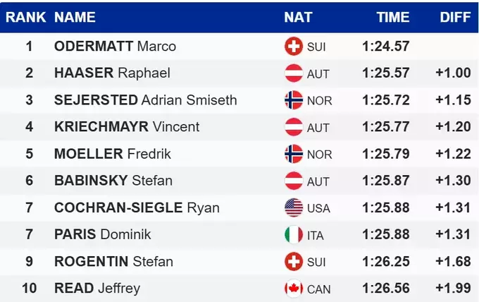 Впевнену перемогу в супергіганті здобув швейцарець Марко Одерматт, який лідирує в загальному заліку Кубка світу. До того ж, спортсмен завоював третю золоту медаль в межах ЧС. З відставанням в одну секунду другим став австрієць Рафаель Хаазер, третій – Адріан Смізет Сеєрштед.