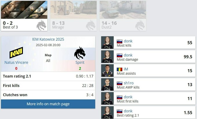 Spirit пробилися у гранд-фінал IEM Katowice, здолавши Natus Vincere з рахунком 2:0 та взявши реванш у команди Алексі «Aleksib» Віролайнена після поразки в груповому етапі у напруженій серії.