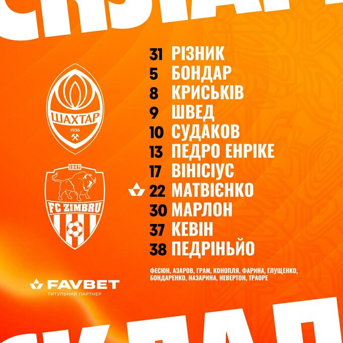 «Шахтар» (1 тайм): Різник – Педріньйо Азеведо, Матвієнко, Бондар, Вінісіус – Криськів – Кевін, Судаков (Бондаренко, 36), Марлон, Швед – Педріньйо да Сілва.