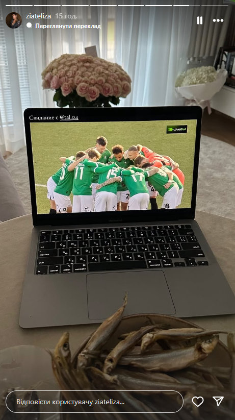 На знімку зі Stories дівчини в Instagram можна також помітити букет квітів, який їй надіслав сам Таловєров, та сушену рибу.