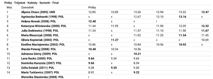 Стрибунка тріумфувала на змаганнях, здобувши перемогу з особистим рекордом 13.47 метрів. Цей результат дніпрянка показала в останній спробі. Друге місце посіла польська спортсменка Агніежка Беднарек – 13.16 м, а бронзу виборола Елена Новак – 12.40 м.