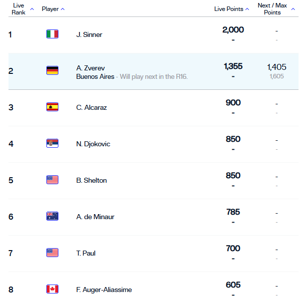 У гонці на Підсумковий турнір АТР перша позиція у Янніка Сіннера, далі йдуть Александр Звєрєв та Карлос Алькарас. Денис Шаповалов завдяки успіху в Далласі наблизився до першої вісімки – дев'ятий.
